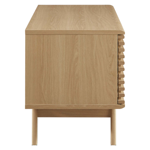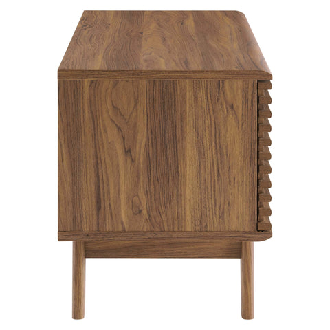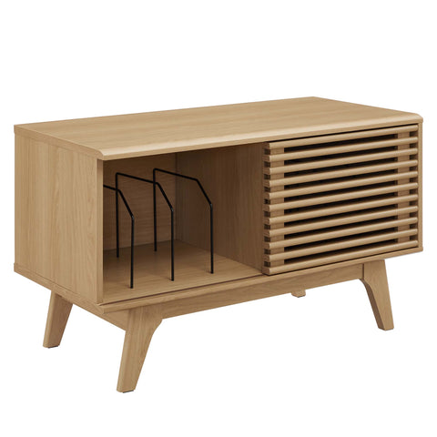 Tap into mid-century aesthetics with the Render Vinyl Record Display Stand. Render features a durable particleboard frame with walnut grain laminate, four tapered wood legs, non-marking foam foot pads, and a sliding slatted door with ample storage space for your vinyl record collection and media essentials. Complete with metal dividers to keep records standing upright, Render’s contemporary linear style is the perfect addition to the modern living room, lounge space, bedroom, or recreation area.