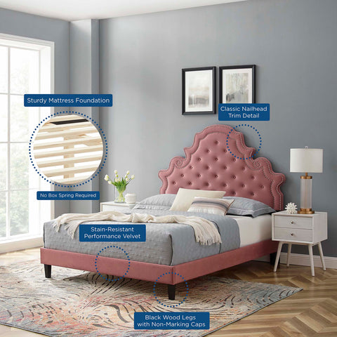 Elaborate details exude regal luxury and vintage glamour in a master bedroom or guest bedroom on the Gwyneth Tufted Performance Velvet Queen Platform Bed. Featuring classic button tufting and nailhead trim framing the avant garde silhouette, the queen headboard of this platform bed is a stunning addition to a master bedroom or guest bedroom. Upholstered in soft, stain-resistant performance velvet, the padded headboard offers supportive comfort while sitting up in bed reading, relaxing, or watching TV. This upholstered bed is a sturdy mattress foundation for memory foam, innerspring, latex, and hybrid mattresses. Eliminating the need for a box spring, the MDF frame of this queen bed is complete with a wood slat support system crafted with poplar for lasting durability and support. This slatted bed frame rests on black wood legs with non-marking foot caps and includes a reinforced center beam with two support legs for enhanced stability. Assembly required. Weight Capacity: 800 lbs.