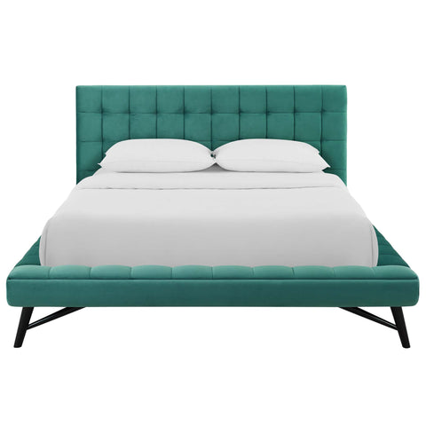 Anchor your bedroom with the charm and sophistication of the Julia Queen Platform Bed. Julia's sturdy, low-profile plywood frame sits atop four splayed and tapered wood legs for an open expanse of restful luxury. Mid-century elegance sweeps into your master suite or guest room decor with Julia's biscuit tufting and polyester fabric upholstery that spans both headboard and frame. Julia's soft and durable stain-resistant performance velvet upholstery covers dense foam padding creating the perfect recline for resting, conversing or reading in bed. Julia comes with a wood slat support system that eliminates the need for a box spring and accommodates memory foam, spring, latex, and hybrid mattresses. This sturdy queen bed frame with a queen size headboard provides support for up to 800 lbs.