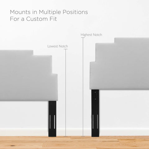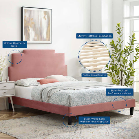 Elevate the style in a guest bedroom or teenager's bedroom with the Lindsey Performance Velvet Full Platform Bed. The padded headboard of this full size bed features luxe texture, clean lines, and escalating silhouette. Rich in glam deco style and vintage modern elegance, this upholstered bed is covered in stain-resistant performance velvet and is a sturdy mattress foundation for memory foam, innerspring, latex, and hybrid mattresses. Eliminating the need for a box spring, the MDF frame of this full platform bed is complete with a wood slat support system crafted with poplar for lasting durability and support. This slatted bed frame rests on black wood legs with non-marking foot caps and includes a reinforced center beam with two support legs for enhanced stability. Assembly required. Full Bed Weight Capacity: 800 lbs.
