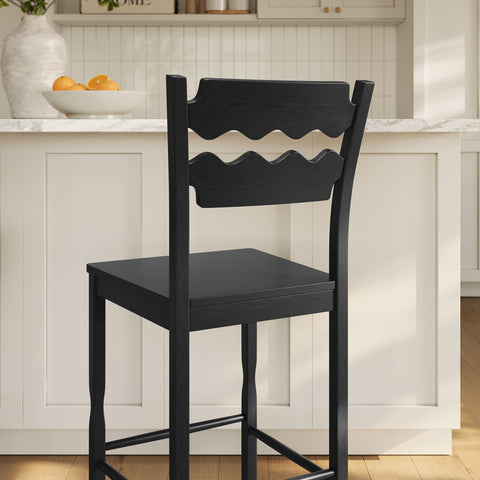 The Jax Single Oak Wood Bar Stool brings a bold, vintage-inspired profile to your space with its unique wavy razor-back. Crafted from solid oak, this wood bar stool stands comfortably at a 29 inch seat height, with the distinct back design giving a quiet nod to vintage bistro barstools. A four-sided stretcher base offers a natural place to rest your feet and keeps the frame feeling steady and supportive, while the armless, open shape keeps the look light and versatile. Jax is a natural fit as a bar height stool for a home bar or as an extra perch around the house. Arriving fully assembled, it comes with non-marking foot pads to help protect your floors. Weight Capacity: 300lbs.