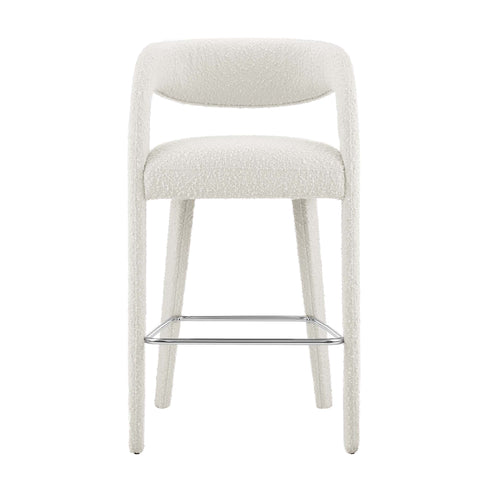 Experience the perfect blend of modern sophistication and luxurious comfort with the Pinnacle Boucle Fabric Upholstered Bar Stool Set of Two. The distinct silhouette showcases a curved backrest and an open design that effortlessly enhances your dining space or kitchen area with luxe style. This bar-height stool set indulges your senses with its dense foam padding, upholstered in a tactile, nubby textured boucle fabric. Non-marking plastic foot pins ensure your flooring remains free from scuffs and scratches. With minimal assembly needed, this bar stool set not only offers a stylish statement but also a hassle-free setup. Weight Capacity: 330 lbs.