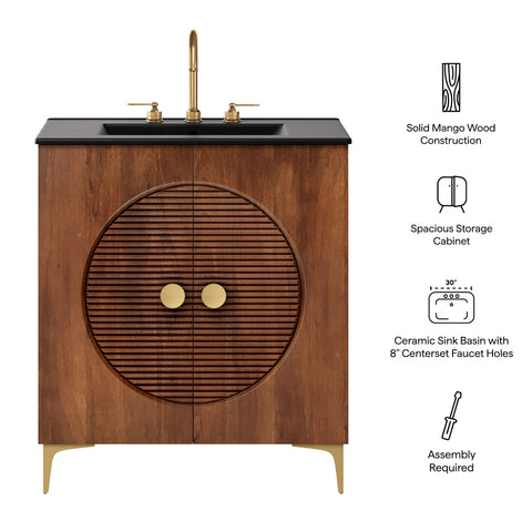 The Vernon Vanity showcases timeless craftsmanship and bold design, blending natural materials with sculptural details. Handcrafted from solid mango wood, this 30-inch freestanding bathroom vanity features a rich finish that highlights the natural wood grain. Its defining element is the fluted circular door front, a geometric detail that adds striking texture and modern character. Topped with a ceramic sink and countertop, Vernon provides a durable and easy-to-clean surface ready for everyday use. Supported by brass legs and accented with concave round brass knobs, this vanity balances mid-century modern inspiration with contemporary elegance. Inside, ample storage space keeps toiletries, towels, and bathroom essentials neatly tucked away. Designed with practicality in mind, the sink comes pre-drilled with 8" widespread holes for straightforward fixture installation (fixtures not included). A versatile addition to modern, transitional, or eclectic interiors, this freestanding vanity brings both function and statement style to any bathroom. Assembly required.