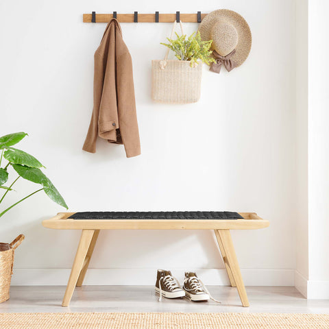 Spark engaging conversations with the Saoirse Bench. Artfully crafted with woven rope over a sturdy rubberwood frame, this bench blends contemporary design with tactile elegance. Non-marking foot pads ensure both stability and floor protection, while the basket weave design and side supports enhance its durability. This modern woven rope wood bench is perfect for the living room, hallway, mudroom, sunroom, entryway, or at the end of the bed. Assembly required. Weight Capacity: 331 lbs.