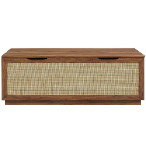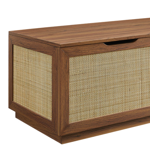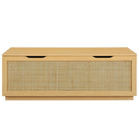 The Soma Entryway Storage Bench features clean lines, natural texture, and everyday function in one streamlined piece. Fully wrapped in faux rattan on all sides and framed in a warm laminated wood blend, this cane rattan entryway storage bench with flip-top hinge brings a light, organic feel to entryways, bedrooms, or under-window spaces. The hinged top lifts easily with two cut-out handles, revealing a deep, divided interior for shoes, blankets, or everyday essentials. Soft-close hinges and a safety warning label offer added guidance in family homes. With a flat base and no exposed legs, this storage bench for entryway sits low and solid, offering a relaxed silhouette that works in both modern and transitional spaces. Weight Capacity: 209 lbs.