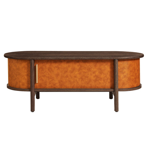 Bring vintage character and thoughtful design into your space with the Coralie Curved Coffee Table. Wrapped in vegan leather with wood grain laminate, this 45" modern center table has a warm, lived-in look that adds depth to any room. The curved profile softens its edges, while the oval shape feels both classic and fresh. On either side, two sliding doors—each accented with a gold-tone handle—opening fully from one end to the other on each side to reveal generous storage space for books, blankets, or anything that should stay close at hand but tucked away. Designed to anchor the room, the Coralie Unique Coffee Table offers a mix of storage, surface space, and vintage charm all in one. Equipped with adjustable non-marking foot glides. Weight Capacity: 165 lbs.