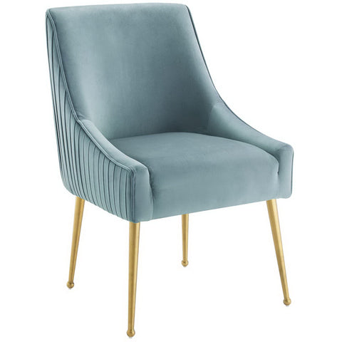 Gently sloping arms cascade down from the flowing design of the Discern Performance Velvet Pleated Back Dining Chair. Solidly constructed from wood and plywood, Discern comes with dense foam padding upholstered in stain-resistant performance velvet. Complete with splayed brushed gold stainless steel legs and matching decorative handle on the back of the chair, Discern is a soft and durable addition to the dining room, kitchen entryway, living room, bedroom, home office, or vanity. Create a cozy seating experience with this versatile dining accent chair with non-marking foot caps.