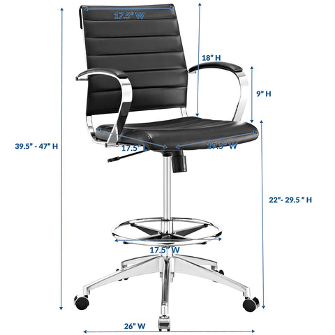 Steer the course and sail to an island called style. Jive is the result of chair makers who decided to design a drafting stool that just works. Functionally, it is a pleasure to sit in as the durable ribbed vinyl back provides natural posture support. The seat cushion and arms are padded, while the form of the armrests was intended to maximize a 90-degree wrist angling for typing. Jive’s chrome-plated aluminum base is fitted with five dual-wheel casters, while a tension knob and tilt lock allow for easy back position adjustments. This drafting stool version of the popular Jive Office Chair series comes with an extra tall gas cylinder and foot ring for a welcome piece that embodies the determination and spirit of the modern office.