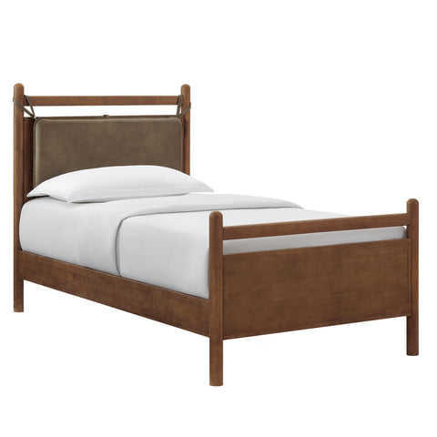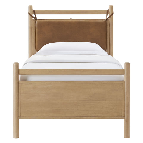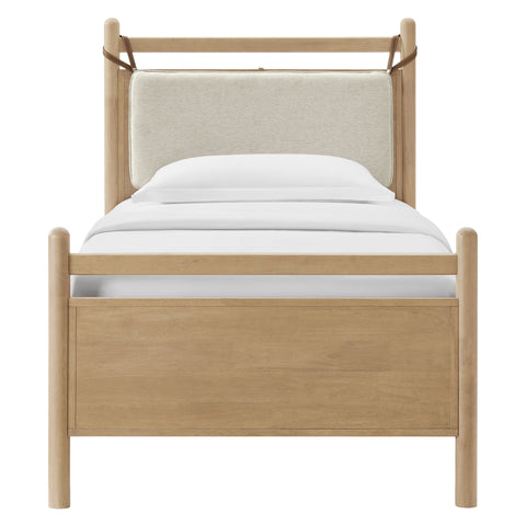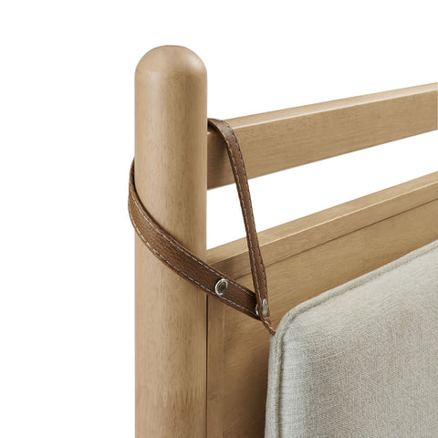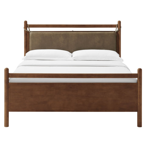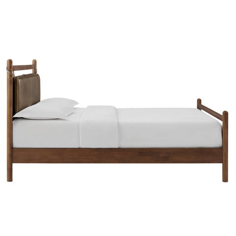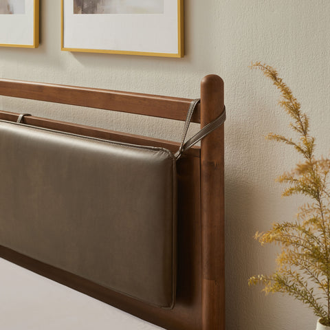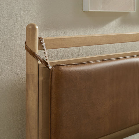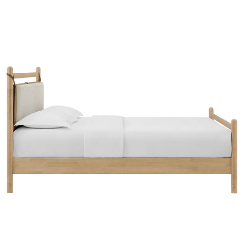 The Leni Queen Platform Bed has a clean, relaxed profile with gently rounded lines. Crafted from solid wood this queen size bed frame features sturdy wooden slats that support your mattress without the need for a box spring. At the head of the bed, a heathered fabric pillow hangs from faux leather straps to create an upholstered headboard that adds padding and a comfortable spot for reading or evening wind-downs. The simple footboard and rounded posts keep the silhouette easy to style, pairing well with a range of bedding and decor from primary bedrooms to guest rooms. This solid wood bed frame with headboard offers stable support night after night with an 800 lb weight capacity.