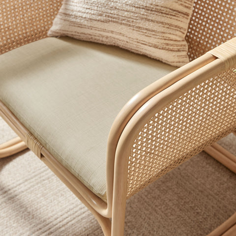 Shaped with a playful mix of curves and angles, the Ellis rattan lounge chair brings a fresh, laid-back energy to living rooms, bedrooms, or sun-filled nooks. Its continuous frame flows smoothly from backrest to base, wrapping around open-weave panels that keep the silhouette light and airy from every angle. A padded seat cushion with a machine washable cover adds comfort without fuss, while the low-slung design makes it a natural pick for reading, relaxing, or unwinding in a quiet corner. Built for everyday use, this rattan accent chair comes fully assembled with non-marking foot caps, making it just as suitable for covered patios or garden rooms. Product Note: Due to the natural qualities of rattan, slight variations in color and pattern are to be expected, adding to each piece’s unique character.