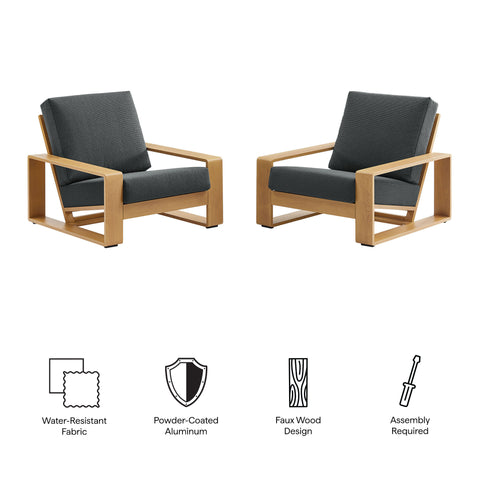 Unwind in sculptural sophistication with the Lirienne Outdoor Patio Armchair Set. Designed for modern relaxation, these two matching outdoor chairs showcase sleek, rectangular frames crafted from durable powder-coated aluminum with a faux wood pattern, offering both resilience and style. The deep, angled seats and plush foam cushions invite you to sink into comfort, while the subtle textured weave upholstery is stain-resistant, weather-resistant, and easy to maintain with removable, washable covers. Perfect for lounging on a sun-drenched deck, cozy balcony, or shaded patio, this set of two aluminum patio chairs brings an air of refined ease to any alfresco setting. Weight Capacity (each): 300 lbs.