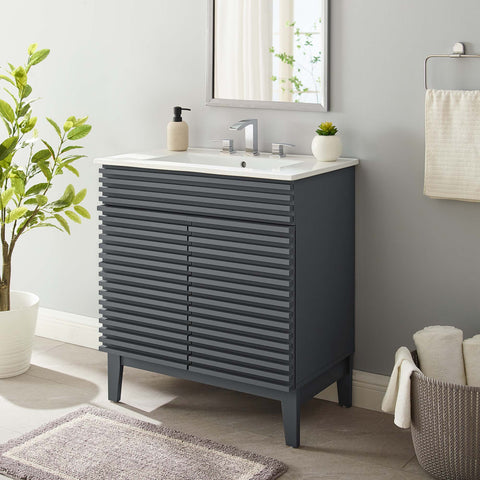 Tap into mid-century aesthetics with the Render Vanity. Render Bathroom Vanity features a durable particleboard frame with smooth laminate, four tapered wood legs, and adjustable storage shelf behind two soft-close hinged doors. A curved ceramic basin and integrated countertop with three faucet holes create sleek lines and crisp design for an edgy style designed to meet your needs. Boasting a mid-century modern style this vanity features a solid construction with a pleasing look and practical functionality. 8" widespread faucet holes. Assembly required and fixtures not included.