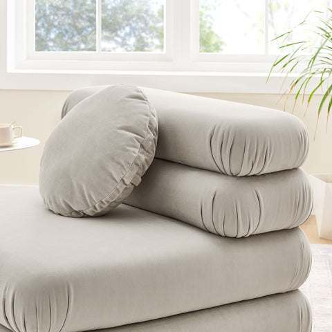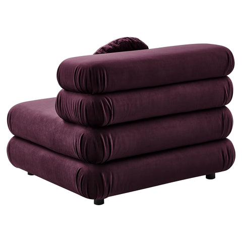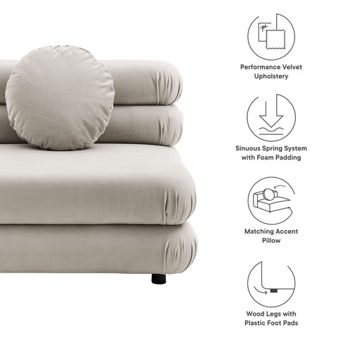 Reimagine your living space with the Jubilee Performance Velvet Armless Chair, a striking blend of retro flair and modern comfort. With its sleek, armless design, the Jubilee Accent Lounge Chair provides a spacious seating experience without compromising on style. Designed as part of the Jubilee sectional sofa set, this modular single sofa chair works as a stylish accent chair or attaches to other Jubilee pieces with an alligator clamp couch connector, making it easy to add additional seating down the line. Draped in stain-resistant performance velvet fabric, this comfy living room chair exudes luxury with its dense foam padding and intricate detailing. The thick, gently tufted cushions are arranged in layers, creating a plush, stacked appearance with rounded edges for a cozy feel. The included 18" round pillow not only adds to its classic charm but also enhances the armless sofa chair's comfort and style, making it an inviting spot to relax. With premium zigzag spring pocket coils for robust support and comfort, Jubilee is the perfect oversized living room chair or bedroom chair for hours of lounging. Equipped with plastic foot pads to protect your floors, this single sofa with round pillow is the retro accent chair your modern decor needs. Assembly Required. Weight Capacity: 331 lbs.