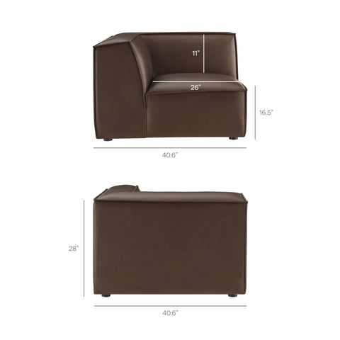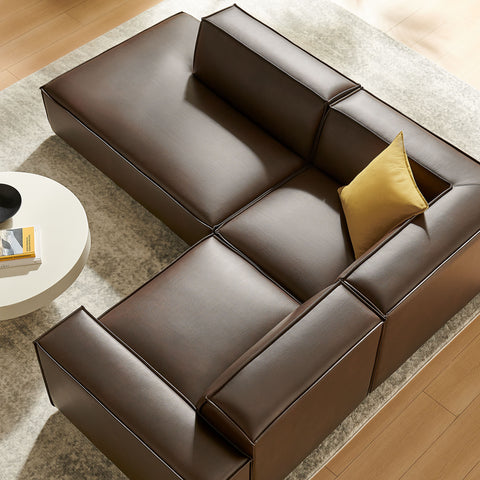 Create your custom living room and lounge area with the Restore Vegan Leather Modular Sectional Sofa. The Restore Sectional Couch features a clean, modern profile with broad lines and French piping details wrapped in soft vegan leather upholstery. Dense foam padding and a pocket coil spring system in each seat offer comfortable, supportive seating for everyday use. Designed as a compact L-shaped sectional, this 3-piece set includes one right-facing arm chair, one corner chair, and one left-facing chaise chair, creating a comfortable layout that works well in smaller living spaces. Built-in connectors keep the pieces aligned and make it easy to expand over time with other Restore pieces. Built on a sturdy wood-blend frame with non-marking foot caps to help protect floors.