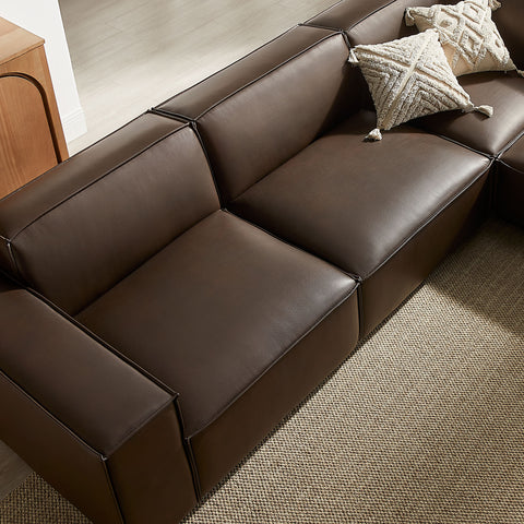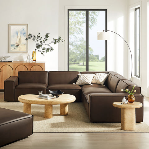 Create your custom living room and lounge area with the Restore Vegan Leather 5-Piece Sectional Sofa. The Restore Sectional Couch features a clean, modern profile with broad lines and French piping details wrapped in soft vegan leather upholstery. Dense foam padding and a pocket coil spring system in each seat offer comfortable, supportive seating for everyday use. Designed to form an L-shaped layout, this modular set includes one left-facing armless chair, one right-facing armless chair, two armless chairs, and one corner chair. Built-in connectors keep the pieces aligned and allow you to add on over time with other Restore pieces. Built on a sturdy wood-blend frame with non-marking foot caps to help protect floors.