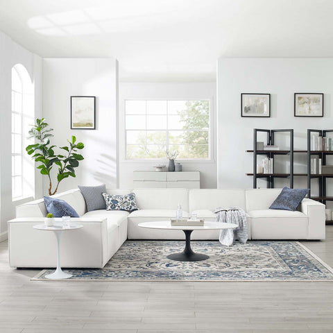 Create your custom living room and lounge area with the Restore Upholstered Fabric 6-Piece Sectional Sofa. The Restore Sectional Sofa appeals to minimalist elegance with a crisp design and broad lines accented with French piping details and polyester fabric upholstery. Dense foam padding and a pocket coil spring system in the cushions offer a luxe seating experience for your living room and lounge. The Restore Living Room Sectional Sofa is solidly constructed from plywood and wood with non-marking foot caps to protect flooring and connectors between modular pieces.