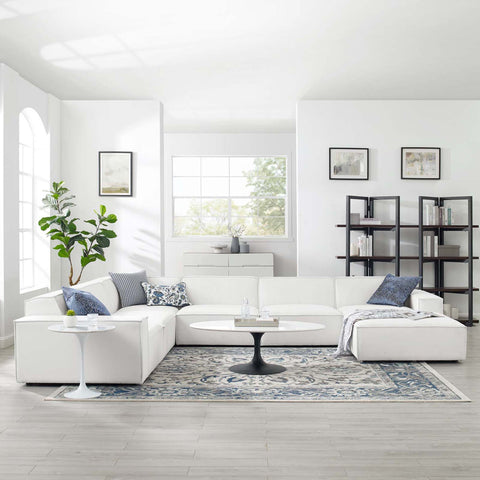 Create your custom living room and lounge area with the Restore Upholstered Fabric 7-Piece Sectional Sofa. The Restore Sectional Sofa appeals to minimalist elegance with a crisp design and broad lines accented with French piping details and polyester fabric upholstery. Dense foam padding and a pocket coil spring system in the cushions offer a luxe seating experience for your living room and lounge. The Restore Living Room Sectional Sofa is solidly constructed from plywood and wood with non-marking foot caps to protect flooring and connectors between modular pieces.