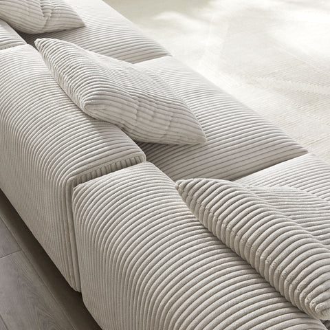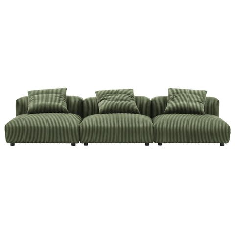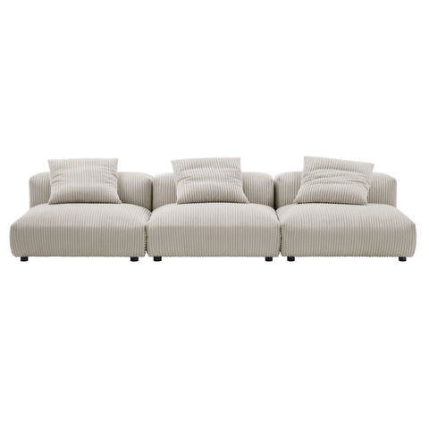 Revel in ultimate comfort and modern style with the Solace Modular Corduroy 3-Seater Sofa. This oversized corduroy sofa is perfect for any living room, offering endless flexibility. Its modular furniture design allows you to change the arrangement to suit the needs of the moment or expand your seating by adding more pieces in the future. Featuring a sturdy frame, dense foam padding, and a sinuous spring support system, the Solace 3-Piece Sofa grants a premium seating experience. The comfy corduroy upholstery adds a cozy, casual vibe, making this armless sectional sofa a perfect addition to any living space or lounge area. Equipped with non-marking plastic glides and complementing accent pillows, this armless modular couch is both stylish and practical. With no assembly required, you can enjoy immediate relaxation with this 3 piece living room set. Set Includes: 3 Armless Chairs