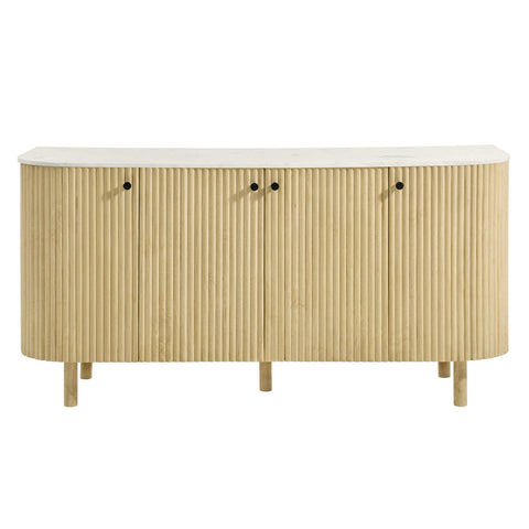 Bring sculptural elegance to your home with the Caldera Curved Sideboard, a seamless blend of natural materials and refined design. Topped with a smooth slab of genuine marble, this 60” fluted buffet cabinet is crafted from solid mango wood and shaped with soft curves that lend an organic, contemporary presence. Four soft-close doors conceal three generous storage areas, each with an adjustable shelf, making this sideboard a multifunctional solution for the entryway, dining room, hallway, office, or as a stand for wall mounted TVs. From storing serveware and linens to organizing media accessories or bar essentials, the Caldera Storage Cabinet is as functional as it is eye-catching. The vertical fluting and rounded edges offer texture and visual depth, while minimalist black hardware maintains a sleek, modern profile. Designed with non-marking floor pads to protect your surfaces, this statement accent cabinet requires straightforward assembly. Weight Capacity: 200 lbs.