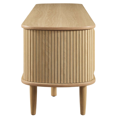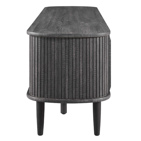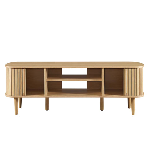 Invite mid-century aesthetics into your living space with the Contour 55" TV Stand. Contour features retro beadboard and an organic silhouette and stands on four tapered legs with two support legs. Crafted with rubberwood, MDF, and particleboard, this entertainment console is complete with a center storage area with an adjustable shelf and open back, as well as two side storage areas with sliding doors to conceal. This media stand accommodates TVs up to 60" and is the perfect modern addition to the living room, lounge area, or recreation room. Assembly required. Weight Capacity: 163 lbs.