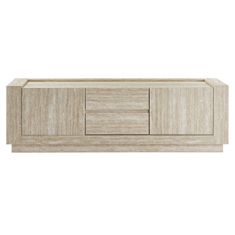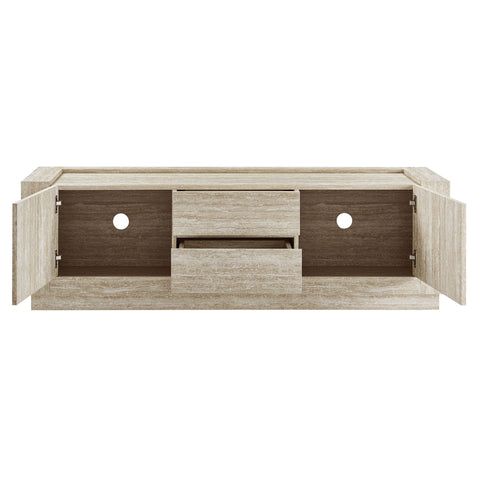 Bring a fresh look to your home with the Hollis Modern TV Stand, a 59-inch media console designed to balance functionality and style. Featuring a sleek travertine laminate finish, this TV stand provides ample storage for all your media essentials and serves as a stylish TV cabinet for your wall-mounted TV. It has 2 doors and 2 drawers, with the interior featuring fixed shelving and deep drawers, allowing you to store electronics, media equipment, or decor with ease. The Hollis low profile TV stand provides versatile storage options while maintaining a clean and contemporary look. Its plinth base and non-marking foot pads ensure stability and floor protection, creating a beautiful entertainment center that complements your home’s decor. This floor TV cabinet is the storage solution you need every day to keep your space tidy and organized. Top Panel Weight Capacity: 271 lbs, Shelves: 44 lbs.