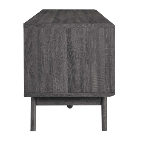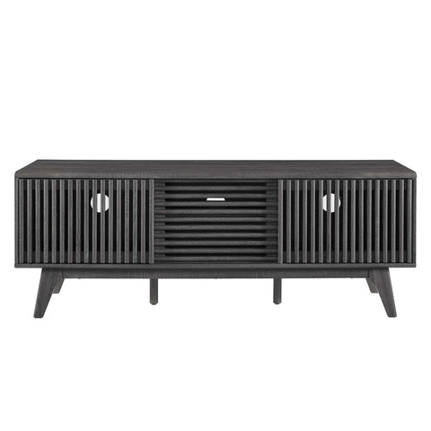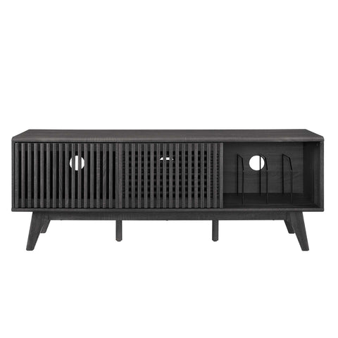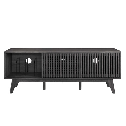 Reclaim modernity in your living space with the Iterate 59" TV Stand. This low-profile entertainment center features three sliding slatted doors, organic aesthetics, and a sleek silhouette to bring contemporary style to your living room, bedroom, home office, or lounge area. Crafted from durable particleboard and wood grain laminate, this TV stand offers spacious storage for all your media essentials with open shelving and a special area to store and display vinyl records or DVDs. The metal partitions are easily removed to allow for open storage space if preferred. With cable managment holes to keep visual space clean, this media console accommodates TVs up to 65 inches. Includes non-marking foot pads to protect flooring. Assembly required. Weight Capacity: 200 lbs.