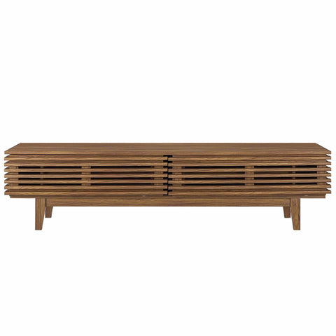 Tap into mid-century aesthetics with the Render 71" TV Stand. This installment of the Render collection features a durable particleboard frame with smooth walnut grain laminate, four tapered wood legs, an adjustable shelf on both sides, two cable management holes, side vertical storage areas, and two bottom-hinged doors for easy access to shelf storage. This versatile mid-century modern living room table features a solid construction with a pleasing look and practical functionality. Perfect for media storage, Transmit accommodates flat-screen TVs up to 78" wide.