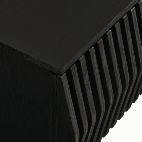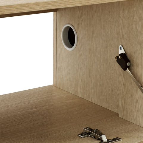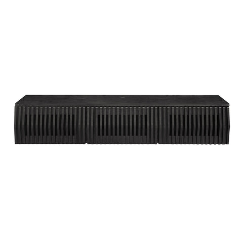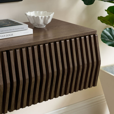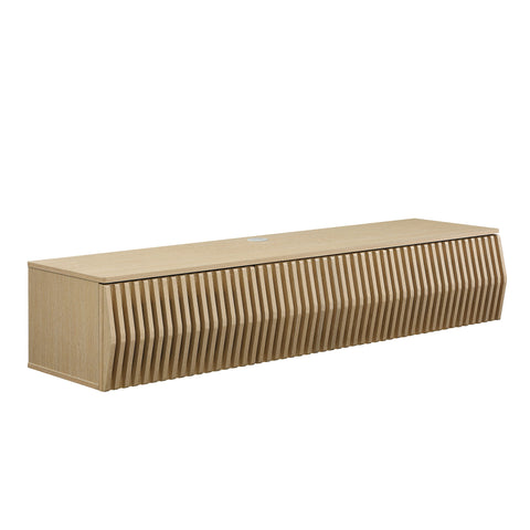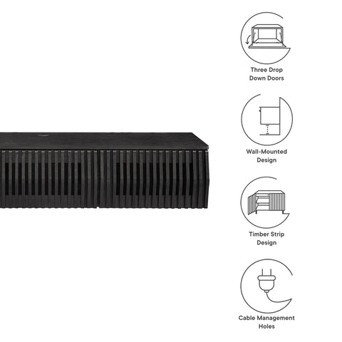 Immerse yourself in the minimalist and functional elegance of the Vaughn Wall Mounted TV Stand. Covered in a smooth laminate finish, this wall mounted TV cabinet provides a sophisticated and contemporary touch to any living space. Its vertical slatted design masterfully conceals three drop-down doors, offering ample concealed storage for media essentials and more. Perfect for the modern living room or lounge, this floating TV stand also features a discrete opening in the back and a cleverly integrated grommet on top for efficient cable management. Whether you're furnishing a chic entertainment center or a cozy recreation area, the Vaughn under TV console is designed to impress, ensuring your media setup is both stylish and organized. Assembly required. Weight Capacity: 192 lbs.