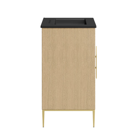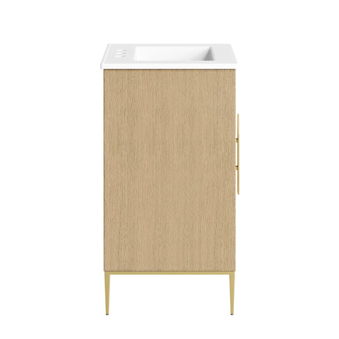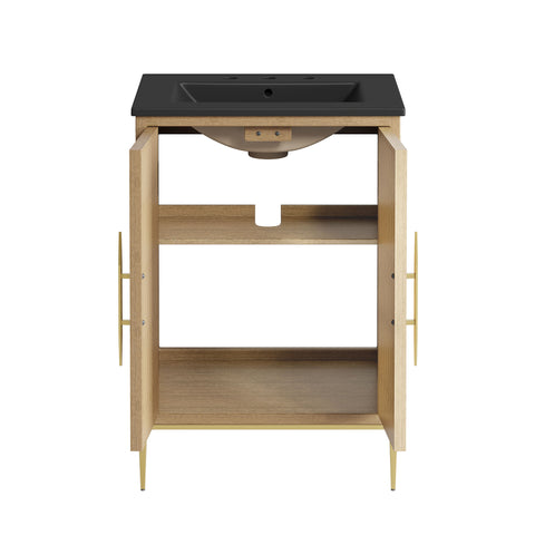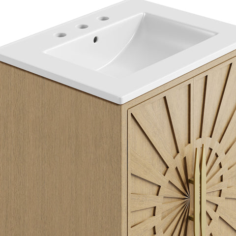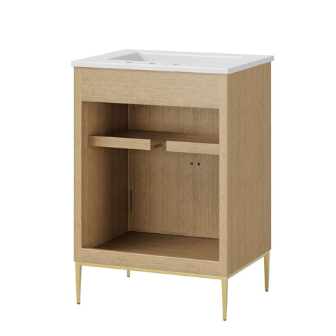 Bring refined modern elegance to your bathroom with the Awaken 24" Bathroom Vanity. The Awaken vanity showcases intricate modernity with clean radial lines crafted from solid wood and durable MDF, resting on a sleek gold base complete with non-marking foot pads to protect your floors. Behind its detailed doors adorned with minimalist gold hardware, you'll find spacious shelves that provide ample storage for all your bathroom essentials. Designed to complement the vanity, the 24" Sink features a rectangular ceramic basin with a narrow integrated countertop and 8-inch widespread faucet holes, delivering a sophisticated look with everyday functionality. Assembly is required.