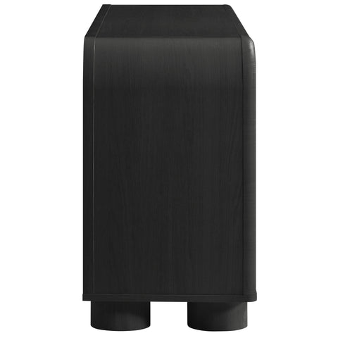 Blending contemporary design with functional elegance, the Bellamy Sideboard Cabinet creates a refined storage solution for dining rooms, living spaces, and entryways. Featuring a gracefully curved silhouette, this modern buffet cabinet makes a stylish statement while offering ample space for organizing dinnerware, linens, household items, or as a TV stand for wall-mounted TVs. Crafted with a beautiful wood grain finish, this storage cabinet is designed with distinctive elongated handle pulls and unique rounded feet, adding a touch of modern sophistication. The soft-close doors open to reveal an adjustable shelf, allowing for customizable storage options. Thoughtfully designed with non-marking floor glides for stability and floor protection, this versatile rounded cabinet is perfect for any space. Assembly required.
