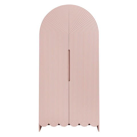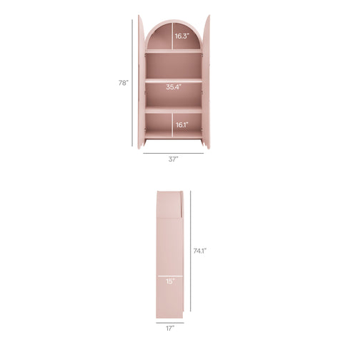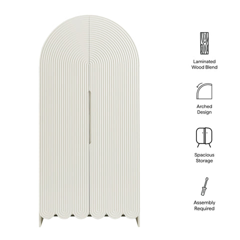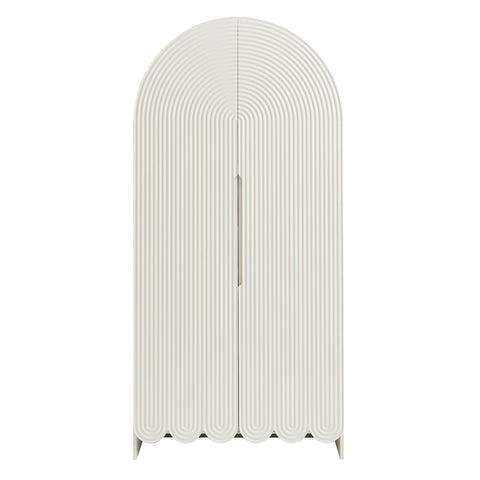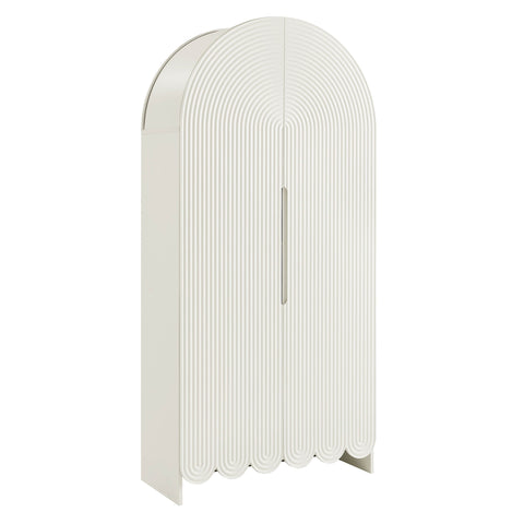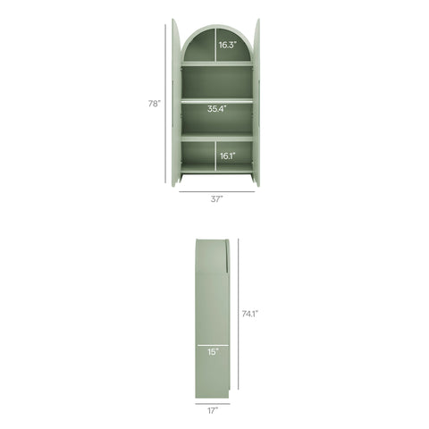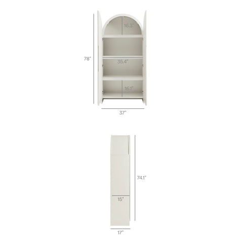 Bring calm, sculptural storage into everyday spaces with the Dahlia 78 Inch Storage Cabinet. Designed as a tall, statement-making accent cabinet, Dahlia pairs a stylish arched top with softly fluted doors, mixing modern curves with subtle vintage details. The doors feature slim recessed handles that echo the curved front, while the scalloped detail along the base adds a playful finish. Inside, four roomy tiers offer flexible space for dishes, pantry items, linens, or décor, making this decorative storage cabinet a practical fit for living rooms, dining rooms, or hallways. Built from a laminated wood blend with soft-close hinges that keep the doors shutting quietly, the Dahlia Arched Cabinet is set on nylon floor glides to help protect floors and make repositioning easier. Assembly required. WEIGHT CAPACITY: Top Shelf : 110lb, 2nd Shelf : 110lb, 3rd Shelf : 110lb, Bottom Shelf : 110lb