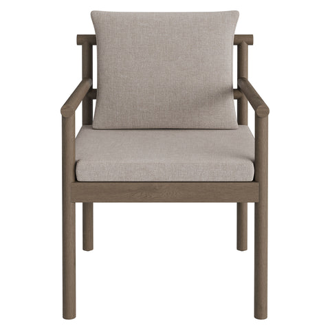 Made for open-air meals, the Eleni Outdoor Teak Wood Dining Set brings a warm coastal presence to patios and decks. Crafted from solid teak that showcases the wood’s natural grain, the 89-inch rectangular table pairs with six armchairs for an easy, gathered look. Each chair features a woven rope accent at the top of the backrest, while the upholstered seat and back cushions that hold their shape through sun and showers. The table’s slatted top promotes airflow and quick drainage, while rounded posts keep the silhouette clean and sturdy. Non-marking foot caps on both table and chairs help protect decking and stone. Simple assembly required