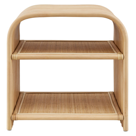Bring a relaxed feel to your space with the Eve Natural Rattan Curved Side Table. Featuring a rounded profile and airy silhouette, this wide accent table or nightstand is crafted from natural woven rattan with curved lines for an organic, easygoing look. A fixed shelf offers room to stow books, candles, or small essentials, while non-marking foot caps help protect wood or tile floors. Perfect beside a reading chair, in a sunroom, or even on a covered patio, Eve arrives fully assembled and ready to add appeal and function wherever it’s placed. Product Note: Due to the natural qualities of rattan, slight variations in color and pattern are to be expected, adding to each piece’s unique character.