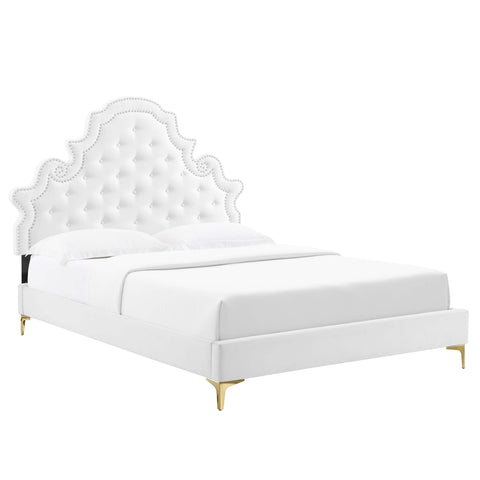 Elaborate details exude regal luxury and vintage glamour in a master bedroom or guest bedroom on the Gwyneth Tufted Performance Velvet Queen Platform Bed. Featuring classic button tufting and nailhead trim framing the avant garde silhouette, the queen headboard of this platform bed is a stunning addition to a master bedroom or guest bedroom. Upholstered in soft, stain-resistant performance velvet, the padded headboard offers supportive comfort while sitting up in bed reading, relaxing, or watching TV. This upholstered bed is a sturdy mattress foundation for memory foam, innerspring, latex, and hybrid mattresses. Eliminating the need for a box spring, the MDF frame of this queen bed is complete with a wood slat support system crafted with poplar for lasting durability and support. This slatted bed frame rests on gold metal legs with non-marking foot caps and includes a reinforced center beam with two support legs for enhanced stability. Assembly required. Weight Capacity: 800 lbs.