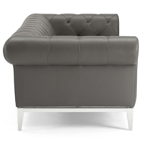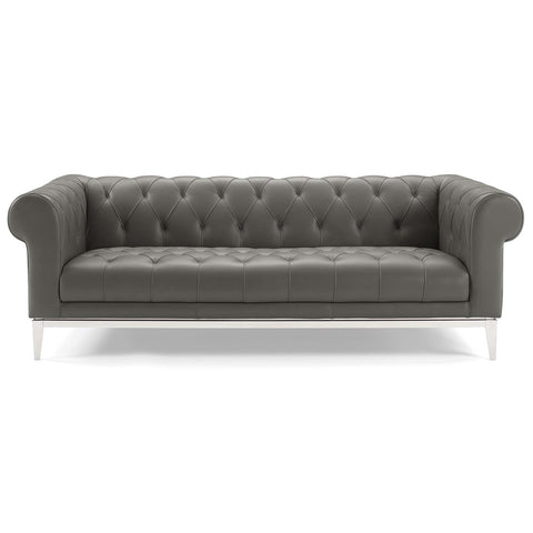 Rollick in the luxurious expanse of the Idyll Leather Chesterfield Sofa. Featuring soft leather upholstery, rolled arms and tufted button accent details, dense foam padding, and a sinuous spring system for responsive support, Idyll creates a lushly comfortable seating environment that invites lingering conversations and leisure time. This 84-inch sofa comes with elegant leather upholstery in this designer couch sure to become the focal point of your home. Supported by a sturdy polished stainless steel frame, enhance your living room decor with the timeless look of this vintage sofa couch. Weight Capacity: 900 lbs.