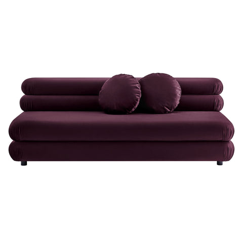 Reimagine your living space with the Jubilee Performance Velvet Armless Loveseat Couch, a striking blend of retro flair and modern comfort. With its sleek, armless design, the Jubilee Accent Loveseat provides a spacious seating experience without compromising on style. Designed as part of the Jubilee collection, this modular loveseat works as a stylish accent piece or attaches to other Jubilee pieces with an alligator clamp couch connector, making it easy to add additional seating down the line. Draped in stain-resistant performance velvet fabric, this oversized loveseat exudes luxury with its dense foam padding and intricate detailing. The thick, gently tufted cushions are arranged in layers, creating a plush, stacked appearance with rounded edges for a cozy feel. The included two 18” round pillows not only add to its classic charm but also enhance the armless loveseat's comfort and style, making it an inviting spot to relax. With premium zigzag spring pocket coils for robust support and comfort, the Jubilee Two-Seater Sofa is the the perfect living room loveseat for hours of lounging. Equipped with plastic foot pads to protect your floors, this upholstered fabric loveseat with 2 pillows is the retro accent couch your modern decor needs. Assembly Required. Weight Capacity: 662 lbs.