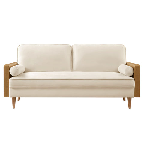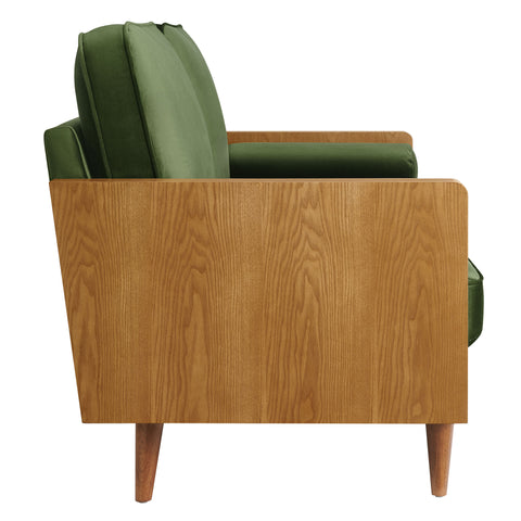 A statement piece for the discerning home, the Kellan Wood Velvet Sofa brings together style and comfort in an updated retro design. This stain-resistant couch is upholstered in luxurious performance velvet, offering a plush, sophisticated look that stands up to everyday life. The beautiful wood grain armrests, crafted from rich veneer, add a touch of natural warmth to its mid century modern contemporary aesthetic. Supported by tapered wood legs with non-marking floor glides, this deep seat sofa provides both style and practicality, protecting your flooring while enhancing the ambiance of your living room, bedroom, office, or reception area. High-density foam padding and zigzag spring support ensure a premium seating experience, while the down feather blend of the back and bolster cushions adds an extra layer of luxury. Whether as a mid century office couch or a plush couch for lounging, the Kellan Retro Sofa is a versatile velvet sofa that will elevate your living space with its refined style and supportive comfort. Assembly required. 3 Seater Sofa Weight Capacity: 893 lbs.