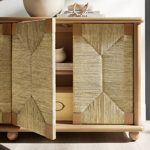Designed for flexibility, the Marola cabinet combines generous storage with a clean, modern look. Crafted from solid oak wood and accented with woven seagrass doors, it brings a light, airy touch that feels both fresh and timeless. Behind four doors, adjustable shelves offer plenty of room for dinnerware, linens, or media. Measuring 71 inches wide, this cabinet with doors and cable management transitions easily between spaces, serving as a sideboard buffet cabinet in the dining room, a storage cabinet in the living room for décor and electronics, or even as a TV stand for wall-mounted TVs. Weight capacity; Top : 346lb, Top Shelf : 20lb, Bottom Shelf : 20lb.