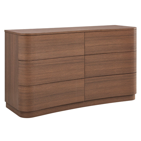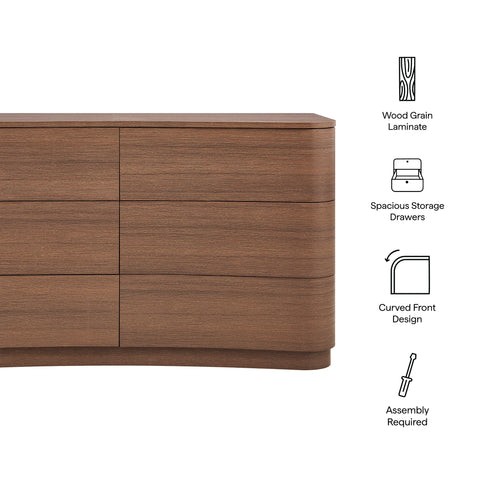Sculptural lines and generous storage make the Mirae 6-Drawer Dresser a standout piece for the modern bedroom. Designed with a wide frame and gracefully curved drawer fronts, this horizontal dresser brings soft edges and visual flow to any space. Smooth wood grain laminate highlights the natural form, while six spacious deep drawers offer plenty of room for clothing, linens, or everyday essentials. Whether styled as a statement dresser in the bedroom, a storage cabinet in the entryway, or even a TV stand dresser for wall mounted TVs in the living or guest room, Mirae blends beauty and functionality in a streamlined profile. Assembly required.