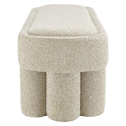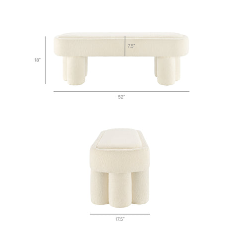 Soft curves and bold geometry define the Mossi Fabric Bench, a modern accent piece with sculptural appeal. Upholstered in boucle fabric, this 52-inch oval bench has a nubby, textured look and an inset seat cushion for added comfort. Resting on cylindrical legs resembling a clover-like base, Mossi makes a striking design statement while providing sturdy support. Whether styled at the end of a bed, in an entryway, or as a lounge bench in the living room, this upholstered boucle bench combines practicality with contemporary artistry. Weight Capacity: 300 lbs.