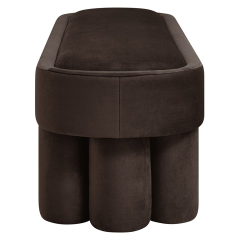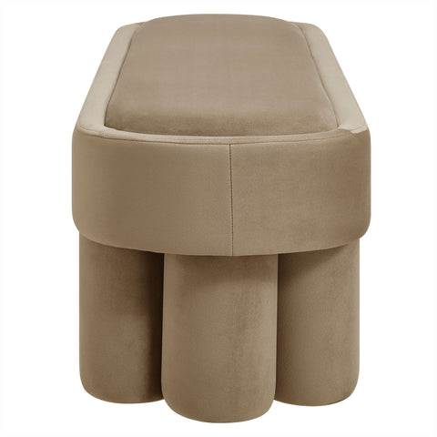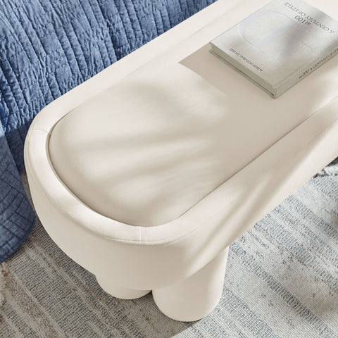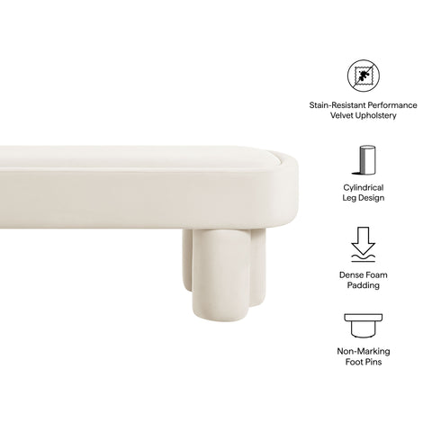 Soft curves and bold geometry define the Mossi Performance Velvet Bench, a modern accent piece with sculptural appeal. Upholstered in stain-resistant performance velvet, this 52-inch oval bench offers a smooth, tailored look with an inset seat cushion for added comfort and refinement. Resting on cylindrical legs resembling a clover-like base, Mossi makes a striking design statement while providing sturdy support. Whether styled at the end of a bed, in an entryway, or as a lounge bench in the living room, this upholstered velvet bench combines practicality with contemporary artistry. Weight Capacity: 300 lbs.