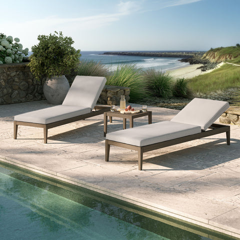 Soak in nature’s beauty with the Northlake 3-Piece Outdoor Furniture Set, featuring two chaise lounges and a matching side table — all crafted from durable teak wood. Each chaise lounge is designed for outdoor use with a slatted seat that promotes airflow and a backrest accented by a distinctive cross-back frame for added support and a refined aesthetic. For personalized comfort, the adjustable backrest offers three reclining positions, allowing you to sit upright, lounge back, or lay completely flat. Plush, all-weather cushions are water-resistant, fade-resistant, and quick-drying, making them ideal for year-round relaxation. The coordinating square side table features a smooth, slatted top for quick drainage and provides a convenient surface for drinks, decor, or poolside essentials. Perfect for patios, decks, or poolside lounging, this outdoor lounge furniture set blends timeless craftsmanship with modern outdoor luxury. Includes non-marking floor glides for added protection. Assembly required.
