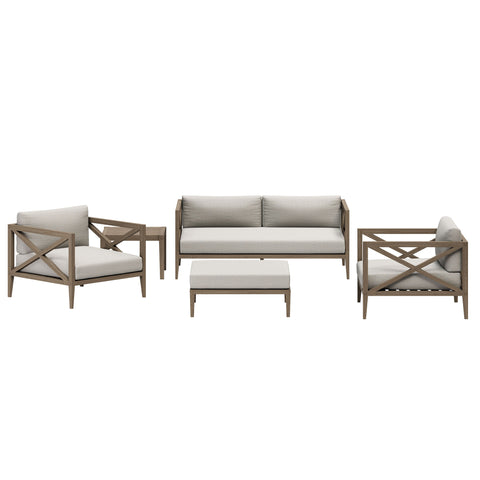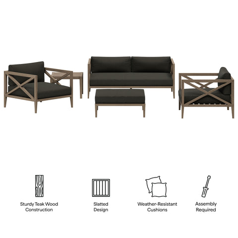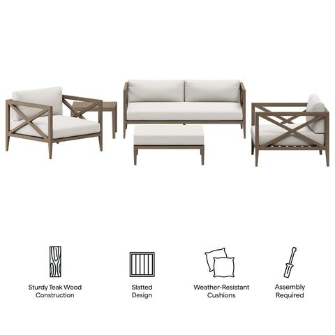 Soak in nature’s beauty with the Northlake 5-Piece Outdoor Furniture Set, featuring a sofa, two armchairs, a matching ottoman, and a side table. All crafted from durable teak, the sofa and armchairs are designed with distinctive cross-back frames for added support and a refined aesthetic, while the ottoman complements the set with a wide, seat and clean, modern look. All three seating pieces include plush, all-weather cushions that are water-resistant, fade-resistant, and quick-drying, providing year-round comfort. Slatted seat bases encourage airflow and lasting durability across the set. The coordinating square side table completes the layout with a smooth slatted top designed for quick drainage, offering a convenient surface for drinks, decor, or outdoor essentials. Perfect for patios, porches, decks, and garden lounges, this 5 piece patio set blends timeless craftsmanship with modern outdoor luxury. Includes non-marking floor glides for added protection. Assembly required.