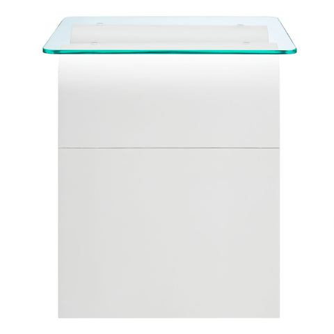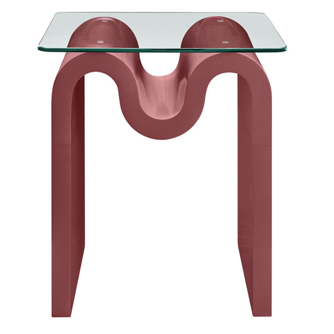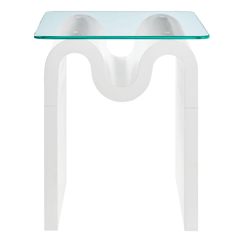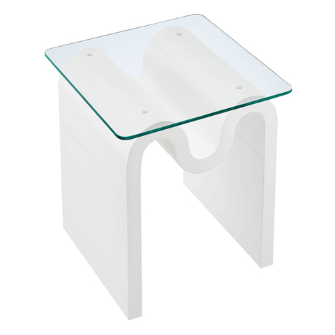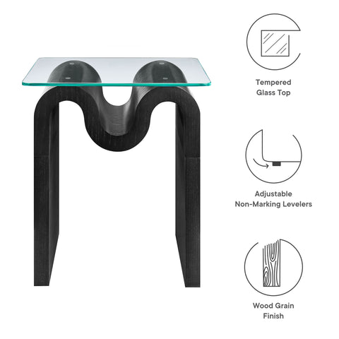 The Ondine Glass Top Side Table stands out with its unique retro design, adding an artistic touch to any space. Its trendy frame, shaped in a bold wave-like form across the top, is crafted from durable materials and finished with a natural ash veneer, providing a rich, textured look or a solid color finish to add some flair to your space. The squiggle-shaped foundation of this minimalist end table brings a sense of movement and fluidity, beautifully contrasted by the clear tempered glass top above it. The glass surface allows the wavy base to remain fully visible, making it the focal point of the design. The rounded edges on this glass side table adds softness to the overall aesthetic, while the clear plastic anti-skid grips offer stability to ensure the glass is secure. The Ondine square accent table is equipped with leveling, non-marking feet that keep the clear side table securely in place without damaging your floors. Whether used as a small drink table in the living room, a plant stand or a boho glass nightstand, this vintage style side table serves as a conversation piece and complements both contemporary and vintage-inspired decor. Glass Accent Side Table Weight Capacity: 88 lbs.