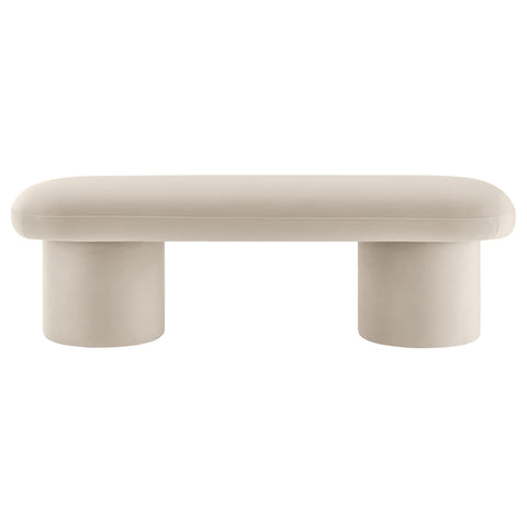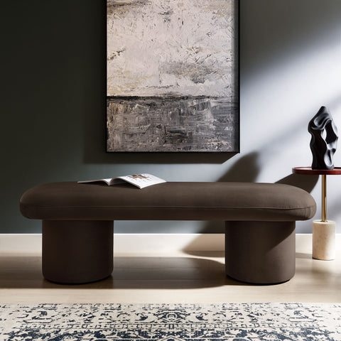 Cozy and chic, the Orla Performance Velvet Bench adds the perfect finishing touch to any space. Fully wrapped in luxurious, stain-resistant performance velvet, this bench sofa offers a soft yet durable seating experience, perfect for everyday use. The plush seat, padded with dense foam, subtly overhangs its round, wide cylindrical legs, which not only provide strong support but also give the modern bench an eye-catching aesthetic. No matter where you place it, Orla looks stunning—whether as an end of bed ottoman, a modern entryway bench, or as additional seating as a living room bench. It also works perfectly as window seating, providing a spacious, comfortable spot to relax and take in the view. Equipped with non-marking floor glides, the Orla Bedroom Bench keeps your floors protected while making it easy to move from one room to another. Fully assembled and ready to use, this velvet ottoman bench brings a soft, modern touch to any decor. Weight Capacity: 220 lbs.