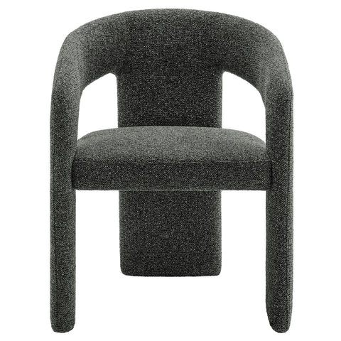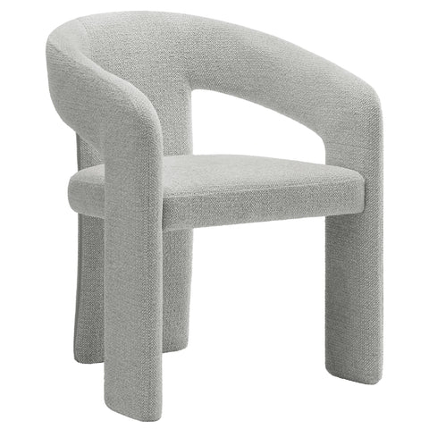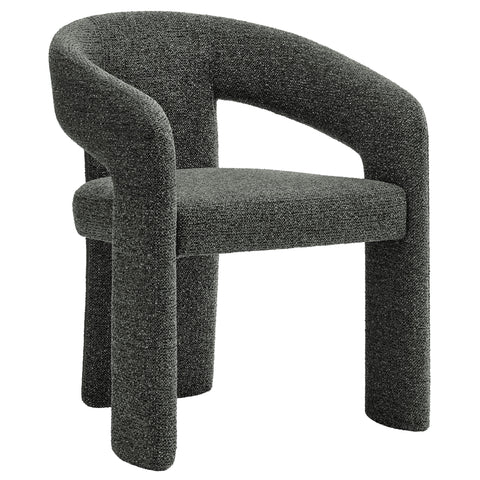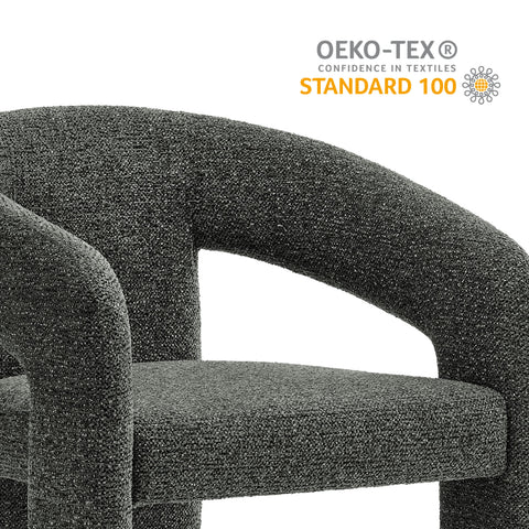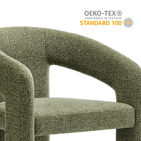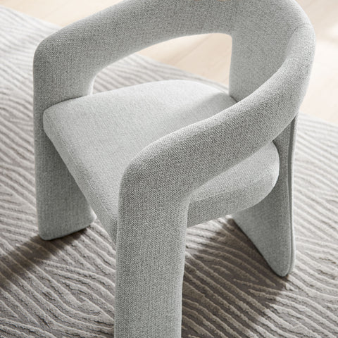 Embrace the perfect blend of modern style and versatile functionality with the Oslo Barrel Dining Chair. Featuring a striking design and unique three-leg frame, this open back chair makes a bold statement in any dining or living space. Fully upholstered in soft textured fabric with captivating depth, the Oslo Accent Chair is as inviting as it is stylish. The barrel-shaped curved back and padded seat offer ergonomic comfort, making it an ideal choice for long meals, work sessions, or relaxation. Better for you and the environment, the upholstery fabric is also OEKO-TEX® STANDARD 100 certified. Supported by a durable metal frame hidden beneath the luxurious fabric, this versatile upholstered chair is as sturdy as it is sleek. Equipped with non-marking floor glides and arriving fully assembled, the 3-leg chair effortlessly enhances any modern dining room, kitchen, or living space. Weight Capacity: 300 lbs.
