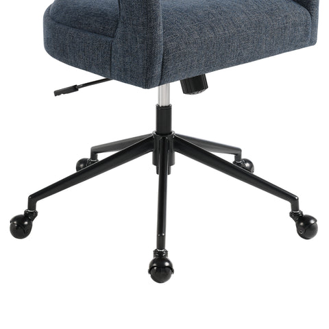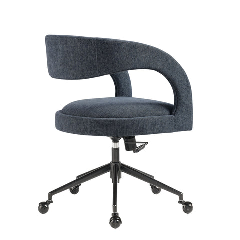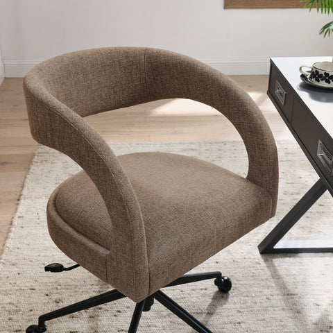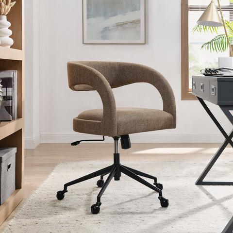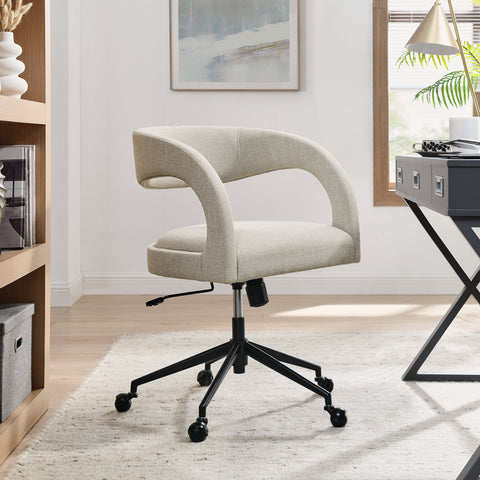 Experience the perfect blend of modern sophistication and luxurious comfort with the Pinnacle Upholstered Office Chair. This barrel office armchair showcases a distinct silhouette with a curved backrest and open design, bringing a stylish flair to your home office, study, or vanity. Upholstered in soft, linen-like slub weave fabric, this adjustable height chair delivers a plush seating experience while complementing any workspace aesthetic. The black powder-coated tubular base on this desk chair is equipped with smooth-rolling rollerball casters for mobility, and the adjustable seat features gas lift height control with tilt tension for personalized comfort. With minimal assembly required, the Pinnacle Home Office Chair offers a combination of effortless style and functionality. Weight Capacity: 299 lbs.