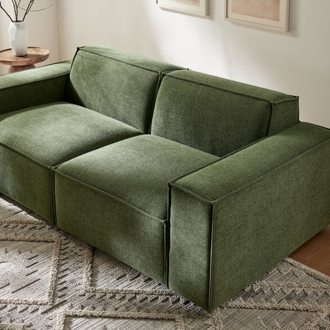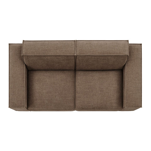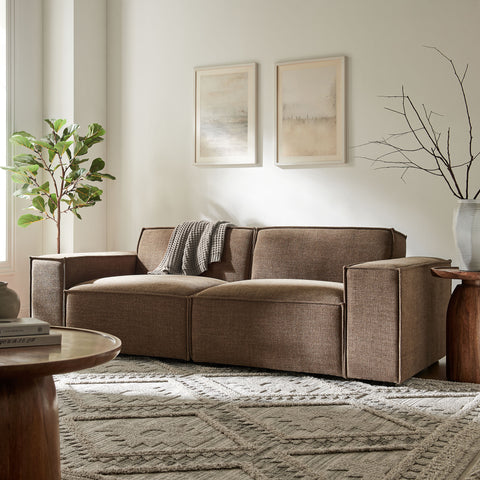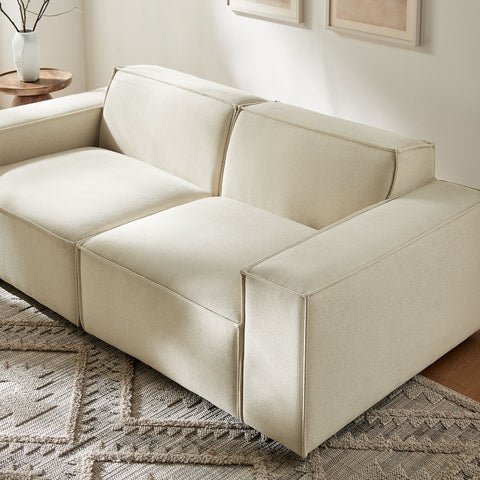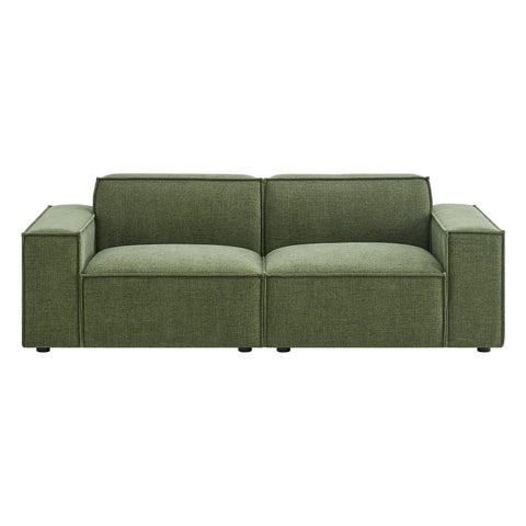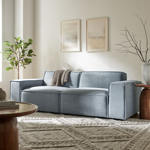 Create your custom living room and lounge area with the Restore Upholstered Fabric 2-Piece Sectional Sofa. The Restore Sectional Sofa appeals to minimalist elegance with a crisp design and broad lines accented with French piping details and soft fabric upholstery. Featuring a high-performance upholstery fabric designed to repel water-based spills and stains—most messes blot away easily with a clean cloth. For stubborn residue, spray with a diluted dish soap solution and blot clean. Dense foam padding and a pocket coil spring system in the cushions offer a luxe seating experience for your living room and lounge. Built on a sturdy wood-blend frame with non-marking foot caps to help protect floors, this modular loveseat can stand on its own or connect easily to other Restore pieces using the built-in connectors.