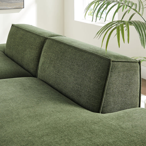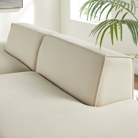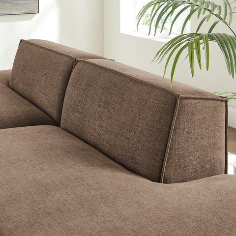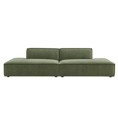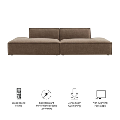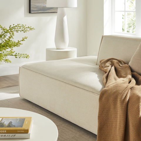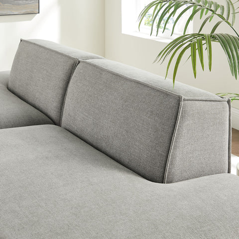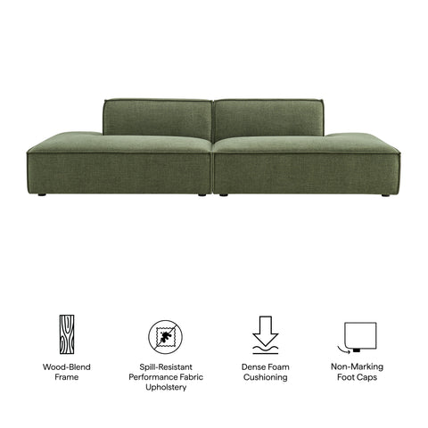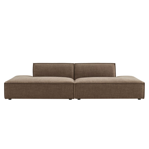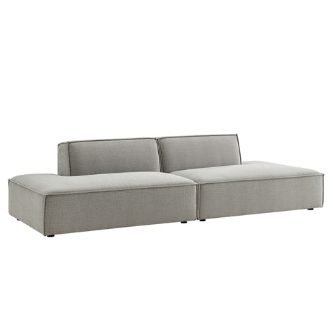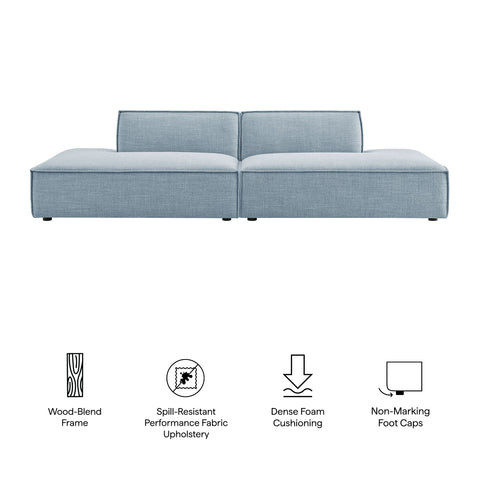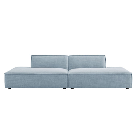 Create your custom living room and lounge area with the Restore Upholstered Fabric Modular Loveseat. The Restore Sectional Sofa brings minimalist appeal with a crisp silhouette, broad lines, and French piping details wrapped in soft fabric upholstery. Featuring a high-performance upholstery fabric designed to repel water-based spills and stains—most messes blot away easily with a clean cloth. For stubborn residue, spray with a diluted dish soap solution and blot clean. Dense foam padding and a pocket coil spring system in each seat offer a comfortable, supportive feel for everyday lounging. Designed as a compact loveseat setup, this 2-piece set includes one armless left-facing chaise and one armless right-facing chaise, creating a relaxed, lounge-ready layout for smaller living spaces. Built-in connectors keep the pieces aligned and make it easy to expand over time with other Restore pieces. Built on a sturdy wood-blend frame with non-marking foot caps to help protect floors.