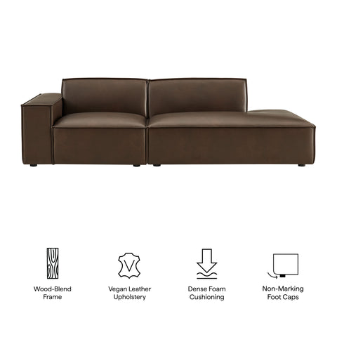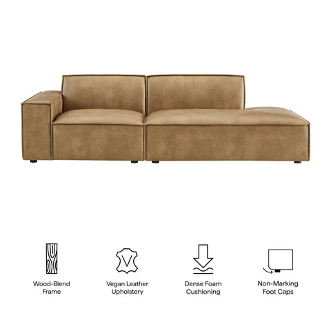 Create your custom living room and lounge area with the Restore Vegan Leather Modular Loveseat. The Restore Sectional Couch features a clean, modern profile with broad lines and French piping details wrapped in soft vegan leather upholstery. Dense foam padding and a pocket coil spring system in each seat offer comfortable, supportive seating for everyday use. Designed as a compact loveseat setup, this 2-piece set includes one left-facing armchair and one right-facing armless chaise chair, creating a relaxed layout that works well in smaller living spaces. Built-in connectors keep the pieces aligned and make it easy to expand over time with other Restore pieces. Built on a sturdy wood-blend frame with non-marking foot caps to help protect floors.
